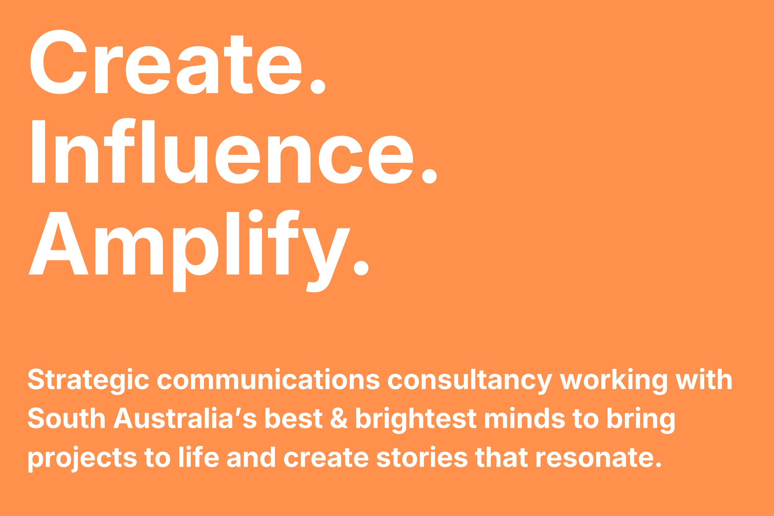 An orange background with white bold text that reads 'Create. Influence. Amplify.' Below it, there is smaller white text that says 'Strategic communications consultancy working with South Australia's best and brightest minds, to bring projects to life, and create stories that resonate.' At the bottom, white bold text reads 'Work with us.'